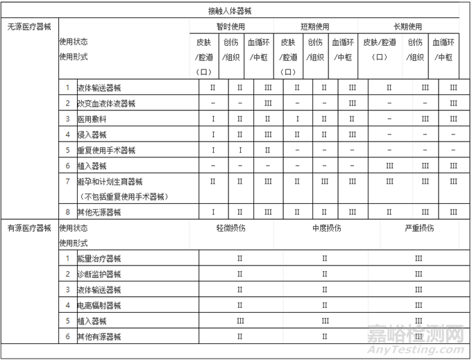 綜合以上因素對(duì)產(chǎn)品的風(fēng)險(xiǎn)程度進(jìn)行判定,最后再結(jié)合《醫(yī)療器械分類判定表》(詳見下圖),進(jìn)而確定醫(yī)療器械產(chǎn)品的管理類別。