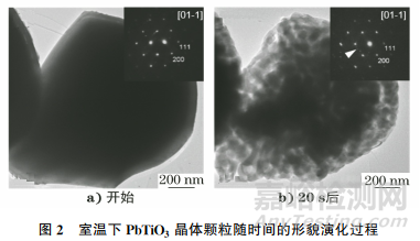 鐘維烈等基于朗道理論計算鈣鈦礦表面能密度,得到PbTiO3鐵電體發(fā)生尺寸驅(qū)動的臨界尺寸為5nm,這與圖2中的測量結(jié)果極為接近。因此可以推測PbTiO3顆粒的細(xì)晶化過程應(yīng)是其表面能主導(dǎo)的。對比室溫下PbTiO3試樣的結(jié)構(gòu)變化,低溫條件使PbTiO3晶體細(xì)化過程明顯變慢。低溫下PbTiO3試樣的細(xì)化晶粒主要在顆粒表面,而室溫下PbTiO3試樣表面與內(nèi)部幾乎同時發(fā)生晶粒細(xì)化過程。在室溫與低溫條件下,隨電子束輻照時間延長,PbTiO3晶粒的形貌結(jié)構(gòu)都趨于穩(wěn)定。