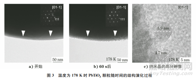 溫度為178K時PbTiO3顆粒隨時間的結(jié)構(gòu)演化過程如圖3所示。由圖3可知:在溫度達(dá)到178K的情況下,PbTiO3材料仍保持鈣鈦礦結(jié)構(gòu);隨著電子束輻照時間的延長,PbTiO3顆粒邊緣逐漸出現(xiàn)細(xì)小的納米晶顆粒,其尺寸約為4.7~5.9nm,這與室溫下細(xì)晶化的過程相似;PbTiO3晶粒并未出現(xiàn)位錯等晶體缺陷,生成的細(xì)晶粒呈均勻球狀,晶體結(jié)構(gòu)與未細(xì)化的PbTiO3晶體一致,且存在一定角度的旋轉(zhuǎn)。