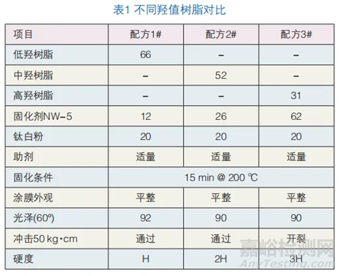 聚氨酯粉末涂料固化成膜的主要化學反應是由羥基樹脂的羥基(—OH)和封閉性多異氰酸酯基(—NCO)之間的反應,同其他體系相比,聚氨酯粉末具有涂膜流平好、交聯(lián)密度大、硬度高、優(yōu)良的耐候性、耐化學性和溶劑性等許多優(yōu)良的性能,能很好地滿足建筑型材要求。因此,我們選擇羥基樹脂及其固化劑作為高硬度粉末涂料的基料。目前羥基樹脂大概分為三大類,即低羥值樹脂(一般羥值在30 mgKOH/g~50 mgKOH/g之間)、中羥值樹脂(一般羥值在90 mgKOH/g~110 mgKOH/g之間)和高羥值樹脂(一般羥值在270 mgKOH/g~330 mgKOH/g之間)。所以需要先研究不同羥值樹脂對涂膜的影響。