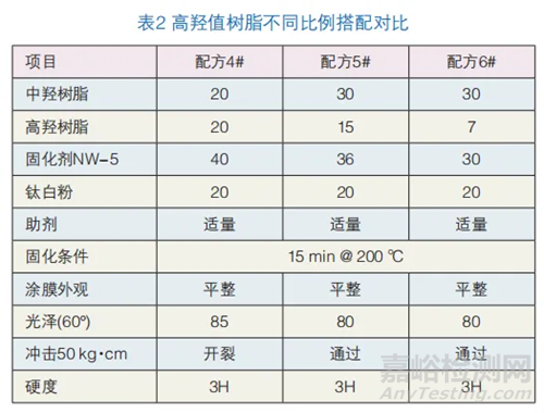 羥基樹脂的羥基和封閉性多異氰酸酯基的反應方程式從表1可知,羥基樹脂的羥值大小對涂膜的影響很大,整體上流平都很好,但隨著羥值的增大,硬度越來越高,其機械性能越來越差。配方1#低羥值樹脂機械性能好,但硬度只有H,后續(xù)實驗就不考慮低羥值樹脂。配方2#硬度2H機械性能好,配方3#硬度3H但機械性能差。對比配方2#和配方3#,將中羥樹脂和高羥樹脂按不同比例搭配使用,研究其對涂膜的影響。