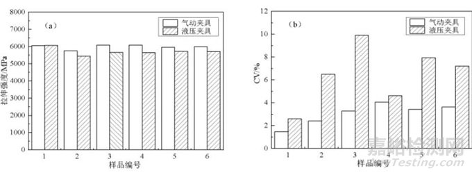 圖1 夾具類型對(duì)QZ5526樣條拉伸性能(a)和CV值(b)的影響