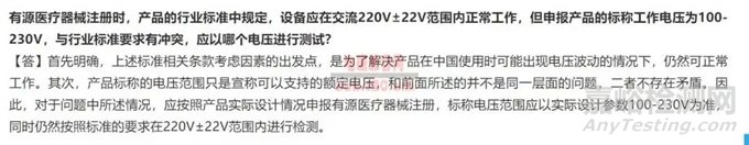 在國內(nèi)的有源醫(yī)療器械進行注冊檢驗的時候,產(chǎn)品的行業(yè)標準GB 9706.1-2020中有明確規(guī)定,該設(shè)備應(yīng)當在交流 220V±22V 的范圍內(nèi)(也就是±10%的電源電壓)能夠正常工作,然而申報產(chǎn)品所標稱的工作電壓卻是 100 至 230V,這與行業(yè)標準的要求存在沖突,那么應(yīng)該依據(jù)哪個電壓來展開測試呢?