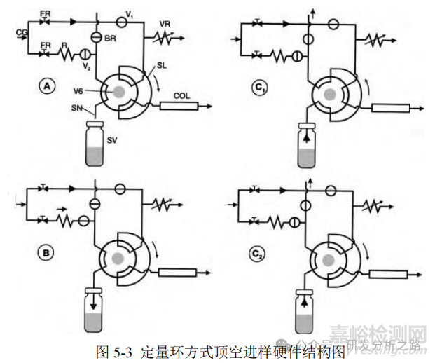 我們較為常用的定量環(huán)方式的頂空進(jìn)樣器,大致結(jié)構(gòu)和工作過程如圖 5-3 所示,可以分成 四個(gè)步驟