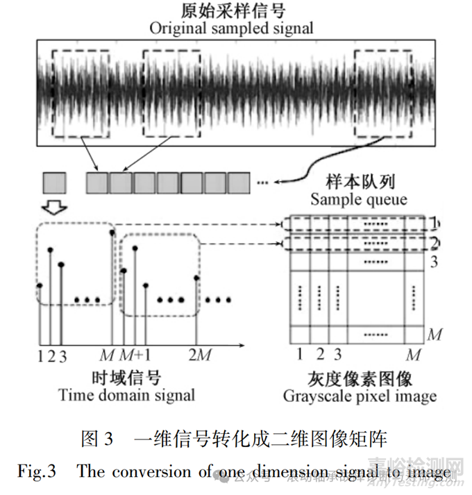 對(duì)于機(jī)械故障診斷,所采集的主要是一維的振動(dòng)信號(hào)等,如何將一維的信號(hào)轉(zhuǎn)換成二維信號(hào),進(jìn)而使用CNN來(lái)診斷便是許多學(xué)者研究的問題。WEN L 等將所采集到的一維振動(dòng)信號(hào)通過(guò)滑動(dòng)窗 的方式截取一段長(zhǎng)度為 1 × M² 的數(shù)據(jù)樣本,然后按順序 排列成 M × M 的二維矩陣具體轉(zhuǎn)化方法如圖 3 所示。