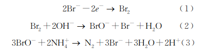 首先,煙草樣品采用凱氏定氮法消解,使其含氮化合物轉(zhuǎn)化為NH4+;然后,利用電解池陽(yáng)極生成的Br2在堿性溶液中發(fā)生歧化反應(yīng)生成BrO−,再氧化還原滴定 NH4+,通過(guò)電位法指示滴定終點(diǎn)并記錄電解時(shí)間,依據(jù)法拉第定律計(jì)算樣品中 NH4+的含量,進(jìn)而測(cè)得煙草中總氮含量。反應(yīng)方程式如式(1)~(3)所示。