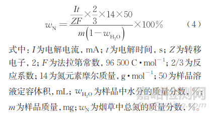在電解池中加入四硼酸鈉-溴化鉀溶液 50mL,插入電極后,連接庫(kù)侖滴定儀,設(shè)定電解電流(20~50 mA),滴加0.1mL樣品溶液預(yù)滴定至終點(diǎn)后,繼續(xù)向電解池中滴加1mL樣品溶液,滴定至電位突躍結(jié)束,將電解時(shí)間代入式(4)計(jì)算樣品中總氮含量。