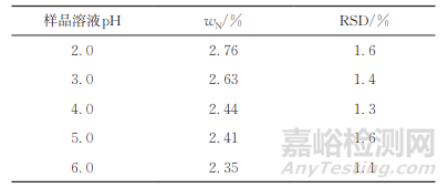 表1 樣品溶液酸度對(duì)測(cè)定結(jié)果的影響(n=5)