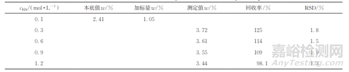 電解質(zhì)溶液濃度既影響電解過(guò)程中電流效率,也可能會(huì)導(dǎo)致發(fā)生其他副反應(yīng)。由于L-天冬氨酸屬于煙草中含量較高的氨基酸之一,因此以其為標(biāo)準(zhǔn)物質(zhì),通過(guò)向煙草樣品1中加入已知量的L-天冬氨酸來(lái)考察不同濃度溴化鉀溶液對(duì)L-天冬氨酸回收率的影響,結(jié)果見(jiàn)表2。
