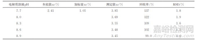 當(dāng)電解質(zhì)溶液pH過(guò)低時(shí),電解生成的Br2難以發(fā)生歧化反應(yīng)生成滴定劑BrO−,同時(shí)滴定過(guò)程中生成的H+會(huì)影響溶液pH,結(jié)果出現(xiàn)正誤差。為此,向煙草樣品1中加入已知量的L-天冬氨酸后,通過(guò)四硼酸鈉緩沖鹽溶液調(diào)節(jié)電解質(zhì)溶液至不同酸度,考察了電解質(zhì)溶液酸度對(duì)L-天冬氨酸回收率的影響,結(jié)果見(jiàn)表3。