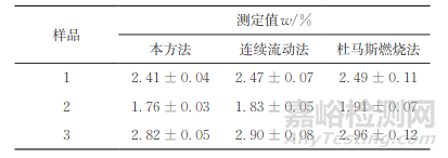 在95%置信度下,對(duì)本方法與YC/T 161—2022中連續(xù)流動(dòng)法測(cè)定結(jié)果進(jìn)行t檢驗(yàn),統(tǒng)計(jì)分析得到的t值均低于臨界值(2.78),表明兩種方法的檢測(cè)結(jié)果不存在顯著性差異。與杜馬斯燃燒法的測(cè)定結(jié)果相比較,二者在不同樣品的測(cè)定結(jié)果最大差值為0.15%,較為相近。但本方法無(wú)需提前準(zhǔn)備大量試劑,且不必繪制標(biāo)準(zhǔn)曲線,檢測(cè)時(shí)間較短,因此操作更為簡(jiǎn)便、檢測(cè)效率更高。