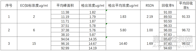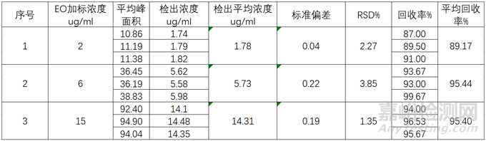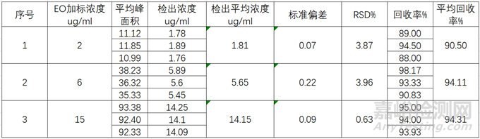 判定依據(jù):EO相對(duì)標(biāo)準(zhǔn)差百分率(RSD)在所使用標(biāo)準(zhǔn)曲線范圍內(nèi)宜不超過5%,根據(jù)藥典要求,該EO濃度范圍內(nèi)的回收率在85%~115%即可,綜合結(jié)果為符合標(biāo)準(zhǔn)要求;