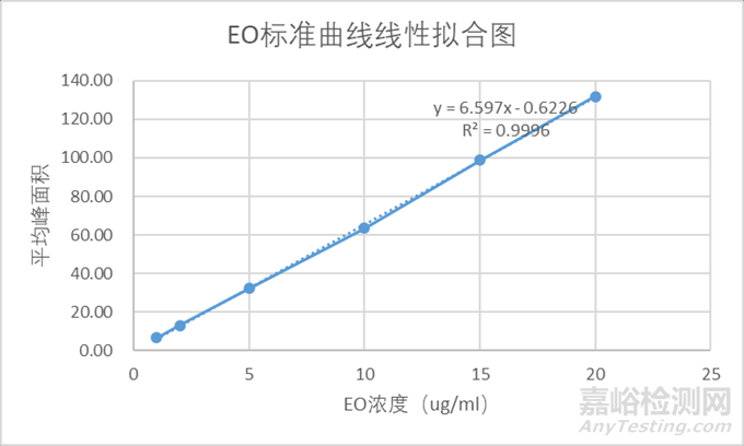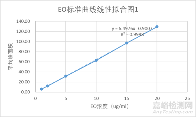 首先需要繪制EO濃度標(biāo)準(zhǔn)曲線方程,用貯備液配制1μg/mL~20μg/mL至少5個(gè)系列濃度的標(biāo)準(zhǔn)溶液,精確量取5mL,置20mL萃取容器中,密封,恒溫(60 ℃士1℃)中平衡 40 min。用進(jìn)樣器依次從平衡后的標(biāo)準(zhǔn)樣迅速取上部氣體,注入進(jìn)樣室,記錄環(huán)氧乙烷的峰高(或面積)。繪出標(biāo)準(zhǔn)曲線(X:環(huán)氧乙烷質(zhì)量濃度,μg/mL;Y:峰高或面積)。下表一為舉例設(shè)置參數(shù)獲得的EO標(biāo)準(zhǔn)溶液濃度與對(duì)應(yīng)的平均峰面積數(shù)據(jù),下圖一為EO標(biāo)準(zhǔn)曲線線性擬合圖;