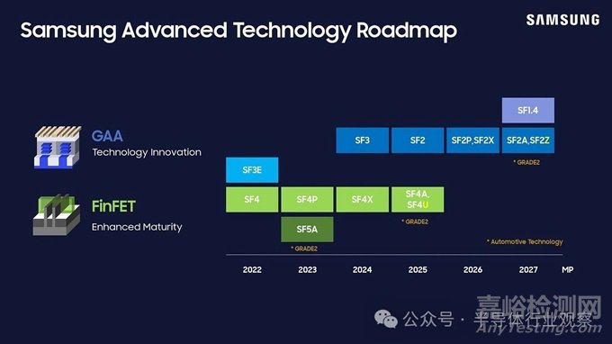 所以這可能會有點令人困惑。三星代工廠宣布,它是第一個使用 SF3E 節(jié)點生產(chǎn) GAA 技術(shù)的公司——恰當(dāng)?shù)孛麨?ldquo;early”。據(jù)我們所知,雖然自 2022 年以來已投入量產(chǎn),但它純粹是一個內(nèi)部節(jié)點,旨在幫助開發(fā)該技術(shù)。英特爾直到 2025 年的 20A/18A 節(jié)點才會推出 GAA,而臺積電也在考慮在類似的時間范圍內(nèi)推出 N2。這兩家公司都希望迅速將其推向市場,而不是像三星那樣提前發(fā)布公告。