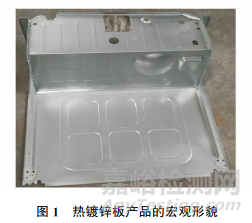 某家電廠冰箱內(nèi)部的熱鍍鋅板產(chǎn)品厚度為0.3mm,材料為 DC51D+Z鋼,該熱鍍鋅板位于壓縮機(jī)上方,起到隔離的作用,對熱鍍鋅板進(jìn)行沖壓后,最大變形處出現(xiàn)凸包現(xiàn)象,凸包高度為10~18mm(見圖1)。熱鍍鋅板的典型力學(xué)性能測試結(jié)果如表1所示。