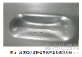 隨著白色家電行業(yè)內(nèi)部的激烈競爭,該家電廠要求將熱鍍鋅板減薄10%,即要求材料的厚度為0.27mm。在成形要求不變的前提下,材料減薄后易發(fā)生沖壓開裂現(xiàn)象。按0.3mm厚正常料的成分和工藝增加軋制變形環(huán)節(jié),生產(chǎn)0.27mm 厚減薄料,經(jīng)家電廠試沖壓驗證,熱鍍鋅板在凸包處發(fā)生開裂現(xiàn)象,開裂位置為靠近凸包頂端的直壁段(見圖2),該處為傳力區(qū),因此在沖壓過程中將承受較大的拉應(yīng)力。