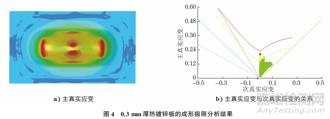 將表1中0.3mm厚熱鍍鋅板的力學(xué)性能代入有限元仿真模型進(jìn)行計算,可以得到?jīng)_壓后材料的成形極限應(yīng)變?yōu)?.204。采用GB/T 24171.2—2009《金屬材料 薄板和薄帶 成形極限曲線的測定 第2部分:實驗室成形極限曲線的測定》,利用成形試驗機(jī)進(jìn)行成形極限測定和理論計算,結(jié)果如圖4所示,材料的成形極限分別為0.24和0.23,處于材料成形極限的安全范圍內(nèi),可以滿足零件沖壓成形的要求。