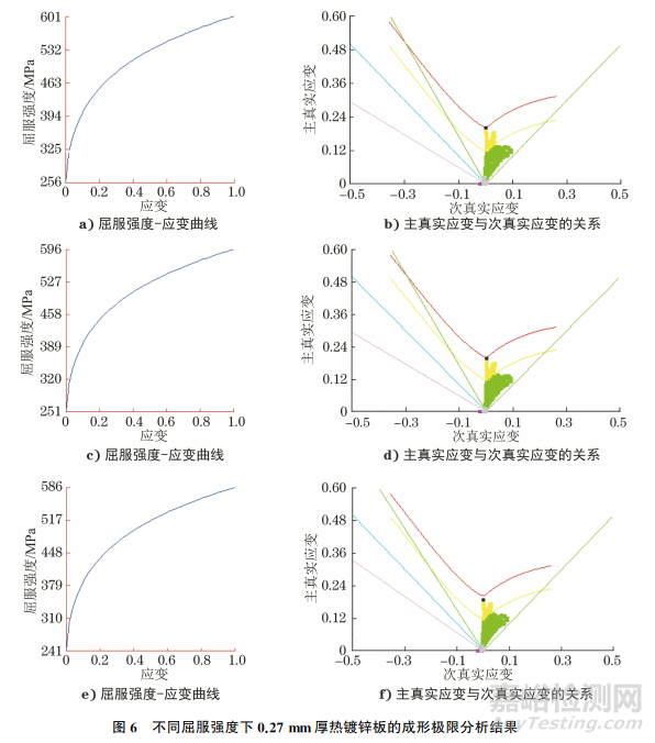 對于拉延類零件,屈服強(qiáng)度越小,材料越容易發(fā)生塑性變形,且材料的冷壓延成形性安全裕度明顯降低。在沖壓工藝不變、加工硬化指數(shù)不變的前提下,計算不同屈服強(qiáng)度下0.27mm厚熱鍍鋅板的成形極限,結(jié)果如圖6所示,可知當(dāng)屈服強(qiáng)度小于256MPa時,材料可以滿足該零件沖壓成形的要求。
