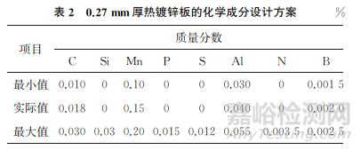 0.27mm厚熱鍍鋅板的化學(xué)成分設(shè)計方案如表2所示。熱軋工藝為:出爐溫度為1180~1220 ℃,終軋溫度為870~900℃,層流冷卻方式,后段冷卻的卷取溫度為680~720℃,熱卷厚度為2.6mm;酸軋軋制厚度為0.256mm,熱鍍后成品厚度為0.27mm。