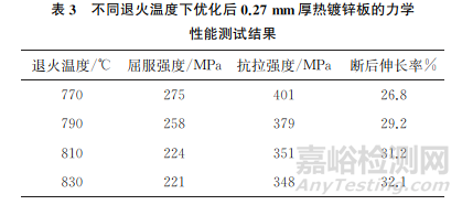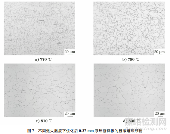 對優(yōu)化后的0.27mm厚熱鍍鋅板分別進(jìn)行770,790,810,830℃退火模擬試驗,然后對試樣進(jìn)行力學(xué)性能測試和金相檢驗,結(jié)果分別如表3和圖7所示。由表3和圖7可知:當(dāng)退火溫度為810℃時,試樣的組織為鐵素體+游離滲碳體,晶粒度級別為8.0級,無滲碳體聚集現(xiàn)象,且屈服強(qiáng)度為224MPa,滿足該零件沖壓成形的要求。