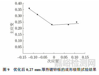 在優(yōu)化后0.27mm厚熱鍍鋅板上取樣,根據(jù)GB/T 24171.2—2009將試樣加工成長度為196mm,寬度分別為20,40,60,80,90,100,120,140,160,180mm的試樣,對試樣進(jìn)行成形極限試驗,結(jié)果如圖9所示,優(yōu)化后0.27mm厚熱鍍鋅板的極限應(yīng)變?yōu)?.23,能夠滿足零件沖壓成形的要求(0.209)。
