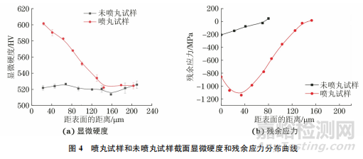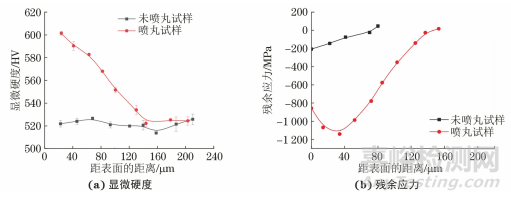 圖 4 噴丸試樣和未噴丸試樣截面顯微硬度和殘余應(yīng)力分布曲線