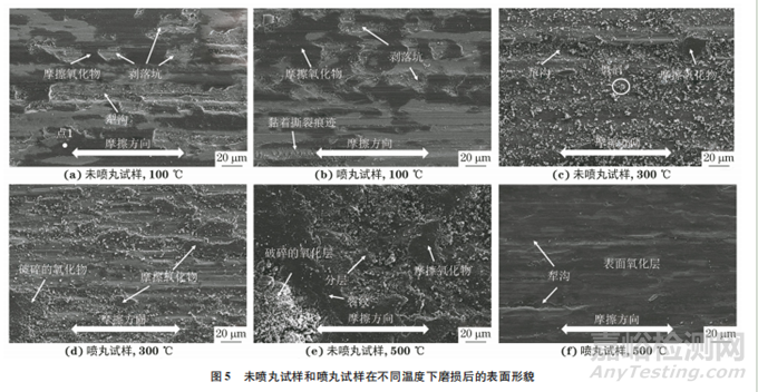 由圖5可見:在100℃下磨損后,未噴丸試樣和噴丸試樣表面均呈撕裂狀,并存在沿摩擦方向分布的溝槽狀磨痕,同時還存在少量細小磨屑;未噴丸試樣表面形成深犁溝,導(dǎo)致基體發(fā)生分層;二者的磨痕表面均出現(xiàn)深色塊狀區(qū)域,EDS(點1)分析顯示其成分(質(zhì)量分數(shù)/%)為56. 8Fe,29.2O,6. 8C,2.9Si,2.2Cr,1. 8Mo,0. 1Mn,0.1V,可知該區(qū)域主要為鐵元素和氧元素,推測是鐵的氧化物。雖然此時的試驗溫度較低,但摩擦過程產(chǎn)生的摩擦熱使磨損表面一些接觸凸起處達到了閃點溫度,同時摩擦過程中氧化反應(yīng)的激活能低于靜態(tài)氧化的熱激活能,因此形成了摩擦氧化物;隨后,在摩擦力的持續(xù)作用下,局部氧化物脫落,產(chǎn)生了一些細小的顆粒狀磨屑。當試驗溫度升至300℃時,2種試樣的磨損表面均出現(xiàn)大量氧化物磨屑,片狀氧化物減少且邊界碎裂,表明此時摩擦氧化物剝落嚴重;由于此時溫度仍較低,新鮮基體未能被快速氧化,而被磨屑反復(fù)犁削,因此形成了大量犁溝狀痕跡。當試驗溫度達到500℃時,試樣表面均被連續(xù)的氧化物覆蓋。根據(jù)氧化磨損理論,表面氧化層通過阻礙摩擦副間的直接接觸起到減摩作用,因此2種試樣在 500 ℃下的磨損率均低于300℃下的磨損率。500℃下未噴丸試樣的表面氧化層破碎和剝落現(xiàn)象明顯,并在剝落處留 下了許多大尺寸的氧化物磨屑。在高溫下當氧化層剝落后,基體迅速氧化,形成氧化-剝落交替的動態(tài)過程,從而造成未噴丸試樣表面氧化物分層現(xiàn)象,氧化磨損較嚴重。噴丸試樣磨損表面形成了較為光滑、致密的氧化層,氧化層表面僅出現(xiàn)少量犁溝狀磨痕,處于輕微氧化磨損階段。由圖6可知,500℃下噴丸試樣和未噴丸試樣磨損表面的氧化物種類相似,主要是 Fe2O3、Fe3O4 和少量 FeO,但噴丸試樣表面的氧化物含量明顯較高,這可能是噴丸強化在試樣表面引入大量缺陷,促進了氧化反應(yīng)的進行。