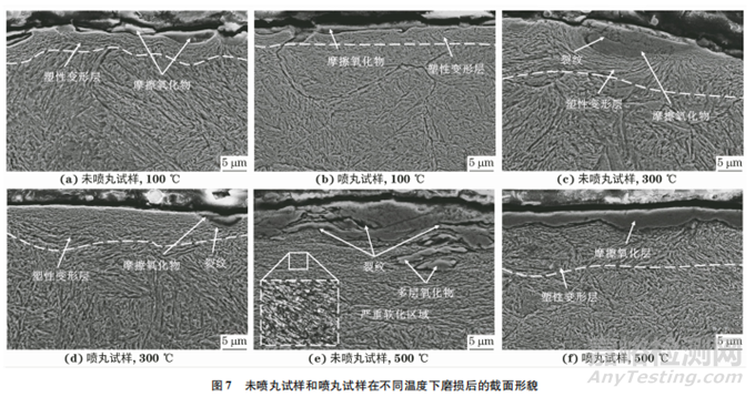 由圖 7可見:在 100℃下,種試樣的磨損表層均存在不連續(xù)的氧化物,氧化物層厚度為 2~3μm,并且表面均出現(xiàn)磨粒犁削的坑狀痕跡,但噴丸試樣磨損表面更平整。隨著試驗溫度升高至 300℃,未噴丸試樣塑性變形區(qū)域出現(xiàn)水滴狀氧化物,而內(nèi)部裂紋在后續(xù)摩擦中擴展,促使氧化物破碎與剝落,同時表面出現(xiàn)下陷的現(xiàn)象;而噴丸試樣表面較平整。當試驗溫度達到 500 ℃時,2種試樣表面均形成一定厚度的連續(xù)氧化層。未噴丸試樣的氧化層及其與基體連接處存在較多裂紋,同時氧化層下方基體組 織出現(xiàn)嚴重的回復(fù)現(xiàn)象,板條狀馬氏體消失,大量碳化物析出。在磨球的擠壓下,未噴丸試樣基體塑性變形嚴重,在碳化物界面處形成應(yīng)力集中,當應(yīng)力達到臨界值后,裂紋萌生并擴展至表面,氧元素通過裂紋進入基體,形成多層氧化物。噴丸試樣磨損表面覆蓋著連續(xù)、致密的單層氧化物,其厚度為3~ 5μm,氧化層表面較平整;氧化層下方基體仍保留板條馬氏體特征,性變形層較薄,說明此時基體仍保持較高的硬度。
