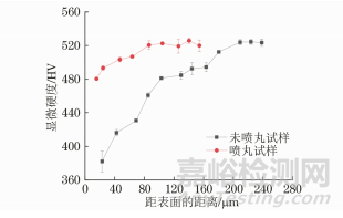 圖 8 未噴丸試樣和噴丸試樣在 500℃下磨損后的截面硬度分布曲線