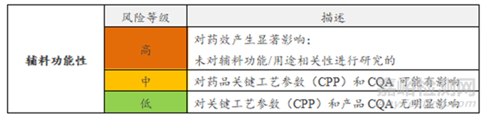 輔料所具備的功能性對制劑的關(guān)鍵工藝參數(shù)(CPP)和關(guān)鍵質(zhì)量屬性(CQA)可能有重要影響。對于藥用輔料的應(yīng)用,不僅僅是制劑成形及工藝過程順利進行的需要,而且對于制劑性能、生物利用度以及藥物緩控釋都具備重要作用。因此,對藥效能產(chǎn)生顯著影響的藥用輔料,可歸屬于高風險;對CPP或CQA有產(chǎn)生影響的,可歸屬于中風險,如片劑填充劑的類型或比例變化可能會影響片劑的溶出度等;對藥品生產(chǎn)CPP或CQA無明顯影響的歸屬為低風險,如包衣材料的色素。
