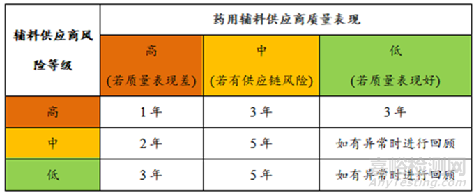 2.3.1.一旦輔料供應(yīng)商資質(zhì)評估合格,批準納入MAH合格供應(yīng)商清單,MAH同時需建立供應(yīng)商監(jiān)控計劃,以維持合格狀態(tài)。供應(yīng)商監(jiān)控計劃包括定期的重新評估,基于供應(yīng)商績效評估,主要包括質(zhì)量表現(xiàn)方面(例如物料或服務(wù)質(zhì)量、審計結(jié)果、合規(guī)問題、偏差響應(yīng)、RFT%等)、其他績效方面(例如供應(yīng)鏈問題、按時交貨與否等)。建議制定以下再評估的頻次,如表3所示: