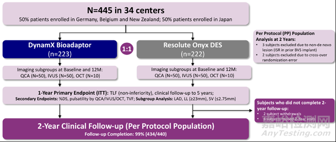 該研究是一項(xiàng)國際多中心、對(duì)照、單盲、隨機(jī)對(duì)照試驗(yàn),總計(jì)納入34個(gè)醫(yī)療中心的445例患者。其中,50%的患者來自德國、比利時(shí)和新西蘭,50%來自日本。這些患者按照1:1隨機(jī)分配,223例患者接受 DynamX 治療,222例患者接受 Resolute Onyx DES 治療。