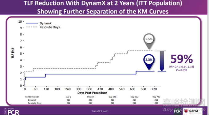 主要終點(diǎn)事件:隨訪 24 個(gè)月,DynamX 組的 TLF 發(fā)生率相較于 Resolute Onyx 組(2.3% vs. 5.5%,P=0.093)減少了59%,且有隨著時(shí)間延長(zhǎng)差距增大的趨勢(shì)。