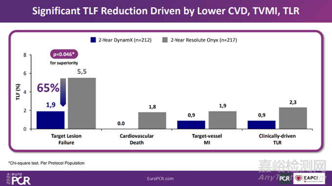 隨訪24個(gè)月,和 Resolute Onyx 組相比,DynamX 組的TLF發(fā)生率下降了65%(1.9% vs 5.5%;p=0.046),同時(shí)CVD、TVMI、TLR發(fā)生率均明顯減少。