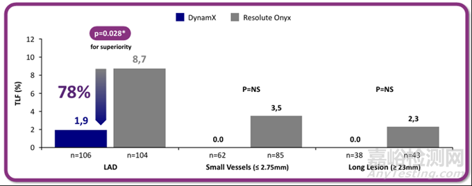 對(duì)于再狹窄風(fēng)險(xiǎn)較高的病變,DynamX 的表現(xiàn)優(yōu)于 Resolute Onyx。和 Resolute Onyx 組相比,DynamX 組的TLF發(fā)生率在左前降支病變、小血管病變和長(zhǎng)病變中均顯著下降,小血管和長(zhǎng)病變的TLF發(fā)生率為0。