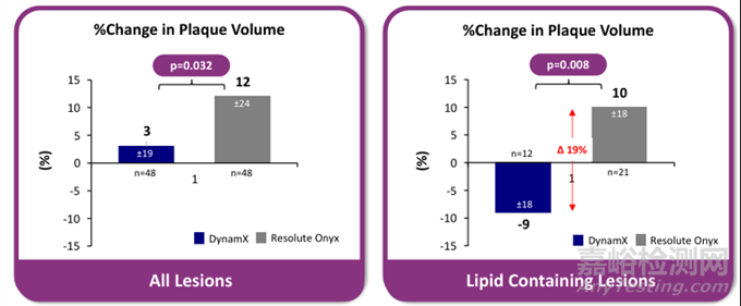 DynamX 組全部病變的斑塊體積(3% [SD 19] vs. 12% [SD 24](P=0.032)和富含脂質(zhì)病變的斑塊體積(-9% [SD 18] vs. 10% [SD 18],P=0.008)均明顯小于 Resolute Onyx 組。