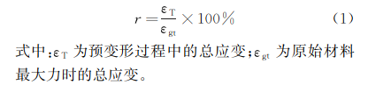 依據(jù)GB/T228.1—2021對試樣進(jìn)行拉伸試驗(yàn),獲得試樣的屈服強(qiáng)度、抗拉強(qiáng)度、斷后伸長率、最大力總應(yīng)變和彈性模量。試驗(yàn)速率為0.45mm/min,試驗(yàn)設(shè)備精度為0.5級,使用精度為0.5級的引伸計對拉伸全過程的應(yīng)力-應(yīng)變曲線進(jìn)行測試并記錄,獲得原始試樣的最大力總應(yīng)變。分別對原始試樣進(jìn)行塑性變形率r為最大力總應(yīng)變的10%,30%,50%,70%,100%的塑性變形預(yù)處理,預(yù)處理速率為0.45mm/min。使用千分尺對預(yù)變形后試樣的直徑進(jìn)行測量,隨后對預(yù)變形后的試樣進(jìn)行拉伸試驗(yàn),獲得不同塑性變形后試樣的應(yīng)力-應(yīng)變曲線。塑性變形率的計算方法如式(1)所示。