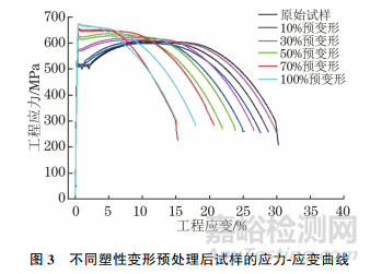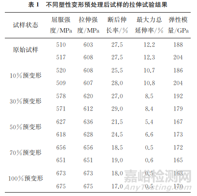 不同塑性變形預(yù)處理后試樣的應(yīng)力-應(yīng)變曲線如圖3所示,試樣的拉伸試驗(yàn)結(jié)果如表1所示。由圖3和表1可知:預(yù)變形過程中,隨著塑性變形率的增大,再次拉伸時試樣的應(yīng)力-應(yīng)變會表現(xiàn)出較大的差異,即塑性變形對材料的力學(xué)性能有較大的影響;隨著塑性變形率的增大,材料屈服時的平臺應(yīng)力會逐漸增大,當(dāng)試樣的塑性變形率超過原始試樣最大力總延伸率的50%時,試樣的屈服平臺會消失;再次拉伸時,應(yīng)力-應(yīng)變曲線在彈性段時達(dá)到最大值,然后迅速下降,直至試樣發(fā)生斷裂。