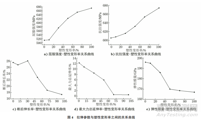 為了探究預(yù)變形處理過程中塑性變形率對拉伸過程中各指標(biāo)的影響規(guī)律,繪制了屈服強(qiáng)度、抗拉強(qiáng)度、斷后伸長率、最大力總延伸率、彈性模量與塑性變形率之間的關(guān)系曲線(見圖4)。由圖4a),4b)可知:隨著塑性變形率的增大,材料的屈服強(qiáng)度和抗拉強(qiáng)度會逐漸增大,當(dāng)塑性變形率為10%時,材料的屈服強(qiáng)度和抗拉強(qiáng)度與原始材料之間的差異較??;當(dāng)塑性變形率大于10%時,材料的屈服強(qiáng)度和抗拉強(qiáng)度會隨著塑性變形率的增大而快速增大;當(dāng)塑性變形率大于50%時,材料的屈服強(qiáng)度與抗拉強(qiáng)度基本相等,因?yàn)樵谒苄宰冃芜^程中,材料內(nèi)部產(chǎn)生了較大的應(yīng)變硬化,導(dǎo)致材料在拉伸過程中的均勻塑性變形能力降低;當(dāng)塑性變形率為100%時,材料的屈服強(qiáng)度和抗拉強(qiáng)度均達(dá)到最大值,約為675MPa,相比于原始材料試樣屈服強(qiáng)度提高約30%,抗拉強(qiáng)度提高約10%。