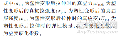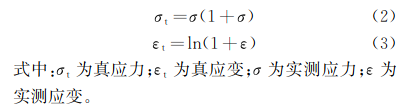 在拉伸過程中,試樣的直徑會隨著塑性變形量的增大而不斷減小,因此測得的應(yīng)力和應(yīng)變小于拉伸過程中試樣在某一瞬時的真實(shí)應(yīng)力和應(yīng)變,為了探究塑性變形率對材料真應(yīng)力及真應(yīng)變的影響規(guī)律,需要對試驗(yàn)測得的應(yīng)力-應(yīng)變曲線進(jìn)行修正。試樣在均勻變形階段真應(yīng)力、真應(yīng)變與實(shí)測應(yīng)力、實(shí)測應(yīng)變的關(guān)系如式(2),(3)所示。