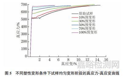將實(shí)測應(yīng)力、實(shí)測應(yīng)變數(shù)據(jù)分別代入式(2)和式(3),獲得不同塑性變形條件下試樣在均勻變形階段的真應(yīng)力-真應(yīng)變曲線,結(jié)果如圖5所示。由圖5可知:不同塑性變形預(yù)處理后試樣的真應(yīng)力-真應(yīng)變曲線在彈性變形階段的曲線斜率基本相同;隨著塑性變形率的增大,材料的真抗拉強(qiáng)度略有增大;當(dāng)塑性變形率為100%時,真抗拉強(qiáng)度為690MPa,其增大幅度小于實(shí)測抗拉強(qiáng)度,即塑性變形對真抗拉強(qiáng)度的強(qiáng)化效果相對較弱。