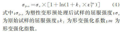 為了定量表征預(yù)變形過程中的變形量對屈服強(qiáng)度的影響規(guī)律,基于應(yīng)變硬化-指數(shù)硬化模型(ESH),建立塑性變形率與屈服強(qiáng)度的關(guān)系模型,如式(4)所示。