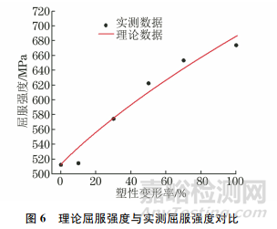 結(jié)合式(1)和式(4)即可獲得拉伸過程中的塑性變形率與屈服強(qiáng)度的關(guān)系模型,式中k=0.039,m=0.312。使用該模型對不同塑性變形條件下的屈服強(qiáng)度進(jìn)行計算,理論數(shù)據(jù)與實(shí)測數(shù)據(jù)的對比情況如圖6所示。由圖6可知:使用該模型得出的理論數(shù)據(jù)與實(shí)測數(shù)據(jù)的相關(guān)系數(shù)為0.99,兩者的吻合度較高。因此建立的塑性變形率與屈服強(qiáng)度關(guān)系模型可以對不同塑性變形條件下材料的屈服強(qiáng)度進(jìn)行計算。