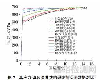 (2)基于ESH模型,建立了塑性變形率與材料的屈服強(qiáng)度、抗拉強(qiáng)度、斷后伸長率、最大力總延伸率之間的關(guān)系模型,使用該模型對不同塑性變形條件下材料的屈服強(qiáng)度及真應(yīng)力-真應(yīng)變曲線進(jìn)行計算,理論數(shù)據(jù)與實(shí)測數(shù)據(jù)具有較好的相關(guān)性,該模型可用于預(yù)測不同塑性變形后材料的拉伸性能。