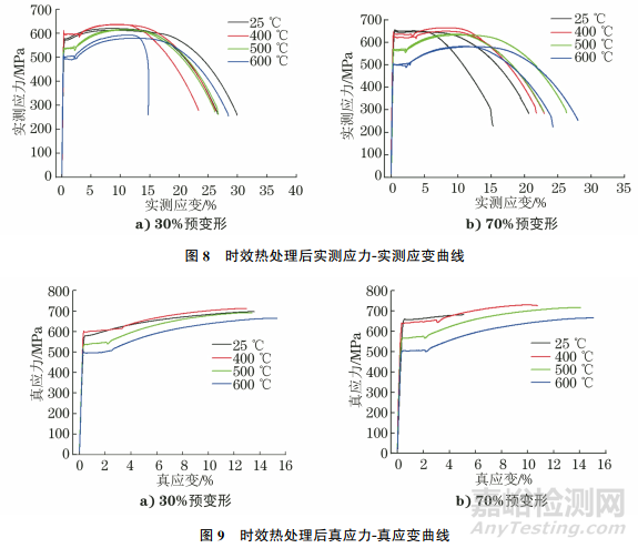 時效熱處理后試樣的實(shí)測應(yīng)力-實(shí)測應(yīng)變曲線及真應(yīng)力-真應(yīng)變曲線分別如圖8,9所示。由圖8,9可知:試樣在塑性變形預(yù)處理后的再次拉伸過程中,從應(yīng)力-應(yīng)變曲線上看,材料并未出現(xiàn)明顯的屈服現(xiàn)象,但是經(jīng)過時效熱處理后,應(yīng)力-應(yīng)變曲線中的屈服平臺較為明顯,即時效熱處理可以有效消除因冷變形引起的應(yīng)變硬化現(xiàn)象,從而提高材料的塑性變形能力。