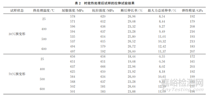 為了探究時效溫度對塑性變形的影響規(guī)律,使用馬弗爐對30%和70%塑性變形后的試樣分別在400,500,600℃溫度下進(jìn)行24h時效熱處理,將時效后的試樣按照上述條件進(jìn)行測試。使用掃描電子顯微鏡 (SEM)觀察不同塑性變形后試樣的斷口形貌。