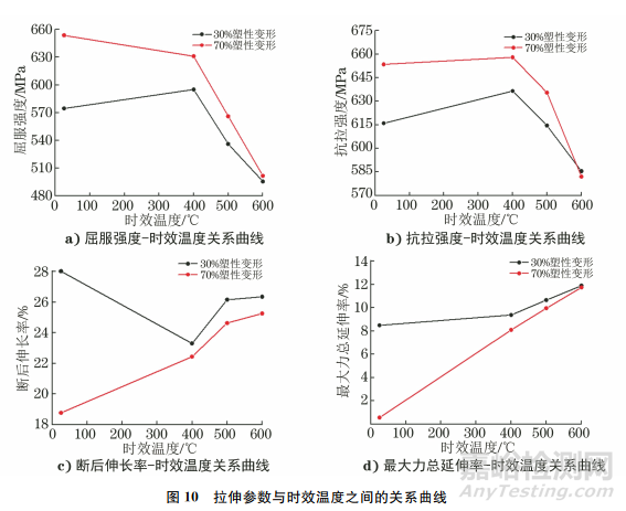 時效熱處理后試樣的拉伸試驗(yàn)結(jié)果如表2所示。為了探究時效熱處理對拉伸過程中各指標(biāo)的影響規(guī)律,繪制屈服強(qiáng)度、抗拉強(qiáng)度、斷后伸長率和最大力總延伸率與時效熱處理溫度之間的關(guān)系曲線,結(jié)果如圖10所示。由圖10和表2可知:當(dāng)塑性變形率為30%時,隨著時效溫度的升高,試樣的屈服強(qiáng)度和抗拉強(qiáng)度均呈先增大后減小的趨勢,試樣的斷后伸長率呈先減小后增大的趨勢;當(dāng)時效溫度為400℃時,屈服強(qiáng)度和抗拉強(qiáng)度達(dá)到最大值,分別為595MPa和636MPa,相比于未進(jìn)行時效熱處理的試樣分別提高了3.5%和3.3%;當(dāng)時效溫度為600℃時,屈服強(qiáng)度和抗拉強(qiáng)度達(dá)到最小值,分別為495MPa和585MPa,相比于未進(jìn)行時效熱處理的試樣分別下降了14%和5%;當(dāng)塑性變形率為70%時,隨著時效溫度的升高,試樣的屈服強(qiáng)度和抗拉強(qiáng)度整體呈逐漸減小的趨勢,時效溫度為600℃時達(dá)到最小值,分別為501MPa和582MPa,相比于未進(jìn)行時效熱處理的試樣分別下降了23%和11%;試樣的斷后伸長率和最大力總延伸率隨著時效溫度的升高而逐漸增大,600℃時達(dá)到最大值,分別由最初的19.0%和0.5%增大至25.5%和11.5%。因此時效熱處理可以消除因塑性變形而產(chǎn)生的塑性降低現(xiàn)象。