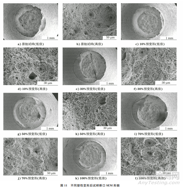 (4)隨著塑性變形率的增大,纖維區(qū)產(chǎn)生的裂紋尺寸先增大后減小。當(dāng)塑性變形率為30%時,裂紋尺寸達(dá)到最大值。當(dāng)塑性變形率超過70%時,試樣斷口區(qū)域不再產(chǎn)生裂紋。不同塑性變形后試樣的斷口均存在大量韌窩,斷裂形式均為韌性斷裂。