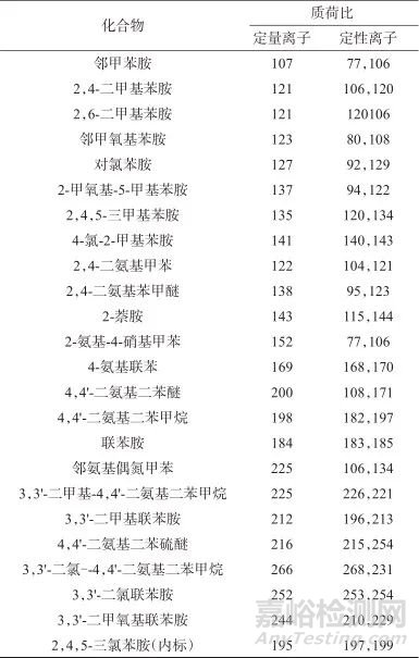 Tab. 1 Qualitative and quantitative ions of 23 aromatic amines and internal standard