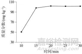 試驗(yàn)方法是通過檢測分解樣品中產(chǎn)生的有害芳香胺反推其中是否含有禁用偶氮染料,還原裂解時間太短會導(dǎo)致偶氮染料裂解不充分,還原裂解時間太長則會延長試驗(yàn)時間,影響檢測效率。分別選擇還原裂解時間為10、15、20、25、30 min進(jìn)行試驗(yàn),其他條件一致,樣品經(jīng)預(yù)處理后采用GC-MS法檢測,3,3'-二甲氧基聯(lián)苯胺質(zhì)量分?jǐn)?shù)測定值如圖2所示。結(jié)果表明,隨著還原裂解時間的增加,3,3'-二甲氧基聯(lián)苯胺測定結(jié)果逐漸增大,當(dāng)還原裂解時間到達(dá)20 min時,3,3'-二甲氧基聯(lián)苯胺測定值最大,故選擇還原裂解時間為20 min。